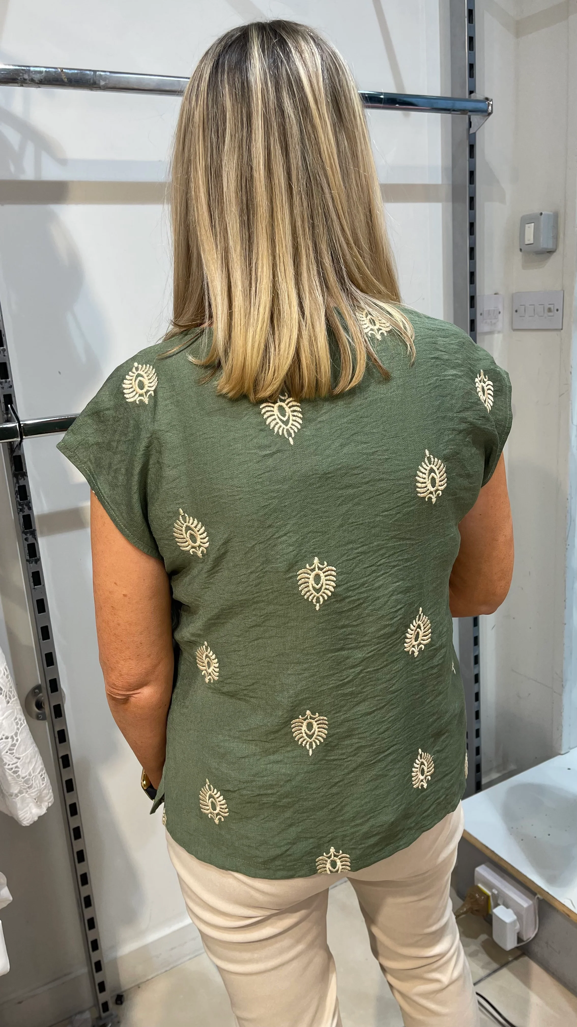Adele - Khaki Embroidery V Neck Top